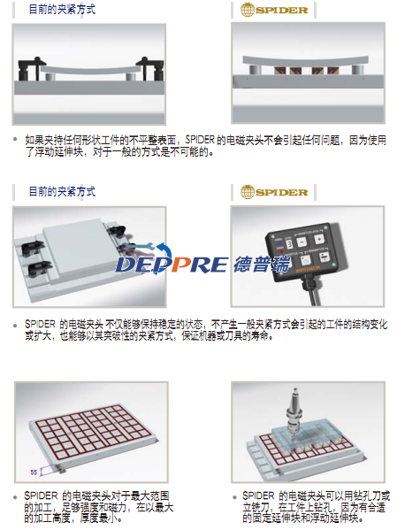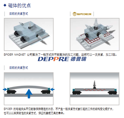 SPIDER MAGNET公司專注于機(jī)床的切割工藝的優(yōu)化,道具的快速負(fù)載和卸載,注塑機(jī)和沖壓機(jī)的模具。因?yàn)橐话愕墓ぷ鲓A緊方式不能滿足客戶的需求,為了緊跟行業(yè)發(fā)展的速度,需要有一種新的工作夾緊技術(shù),所以,我們公司開發(fā)了一種可靠和優(yōu)異的永久電磁夾頭。當(dāng)前,大部分好公司使用優(yōu)質(zhì)的機(jī)床和性能優(yōu)異的CAD/CAM系統(tǒng)來提高生產(chǎn)力。然而,由于普通的工作夾緊方式能力有限,與機(jī)床和CAD/CAM系統(tǒng)的價(jià)值不匹配,與不能100%發(fā)揮其能力。