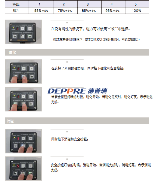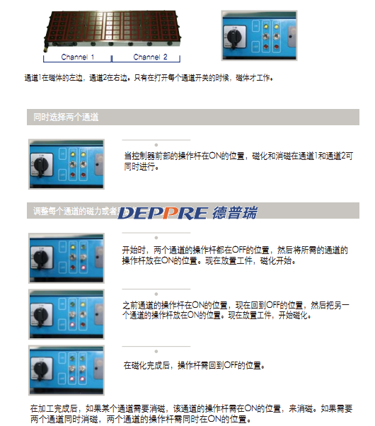 磁化和消磁可在中間分開的通道1和通道2,獨(dú)立進(jìn)行。每個(gè)通道可選擇不同的磁力,分開使用: